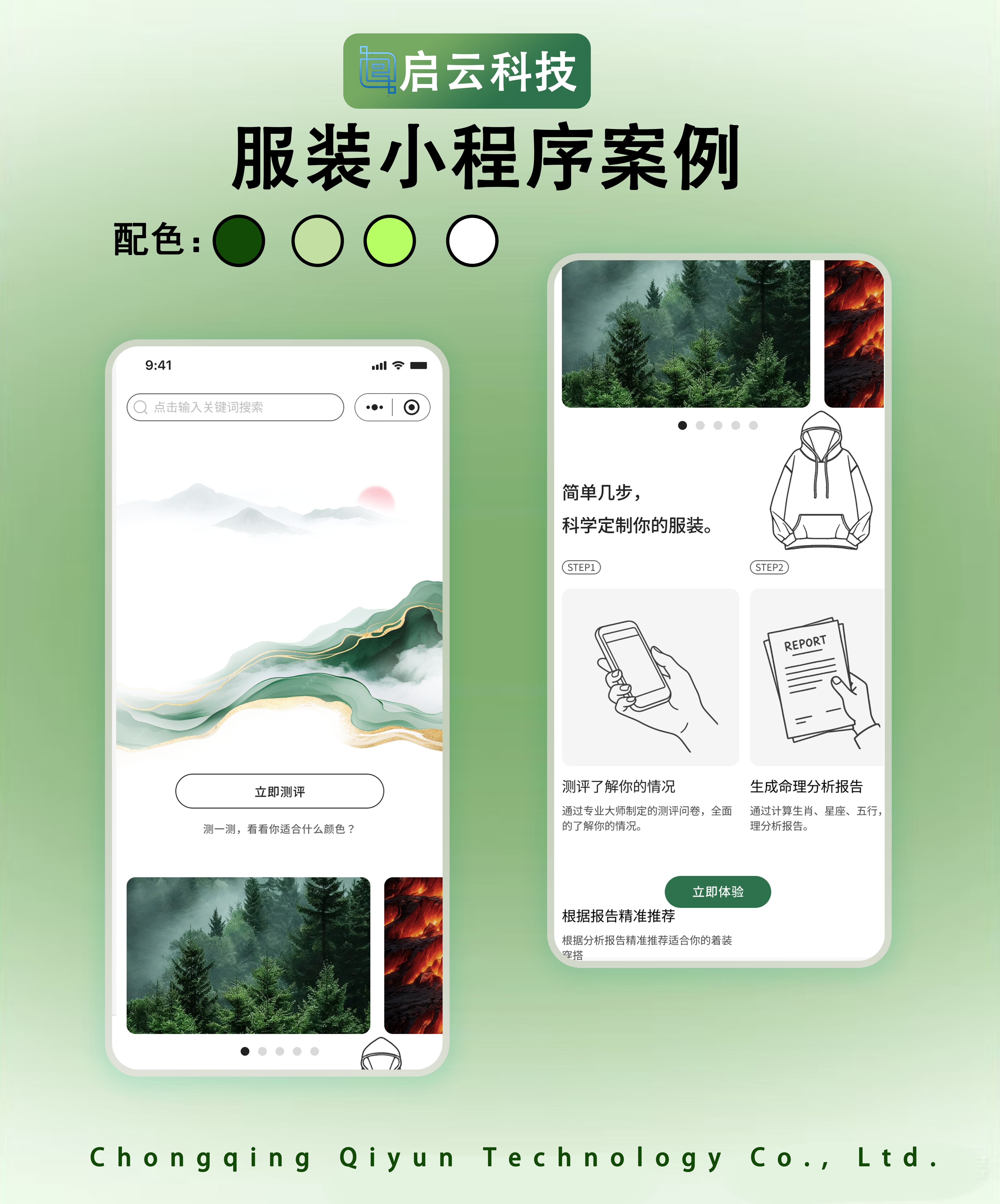 国风特色服装定制类小程序,以 “山水墨韵 + 自然色系” 为视觉基调,融合传统命理文化与现代服装定制逻辑,为用户提供 “个性化测评 + 精准推荐 + 专属定制” 的服装服务,适配追求文化属性与专属感的消费群体。
