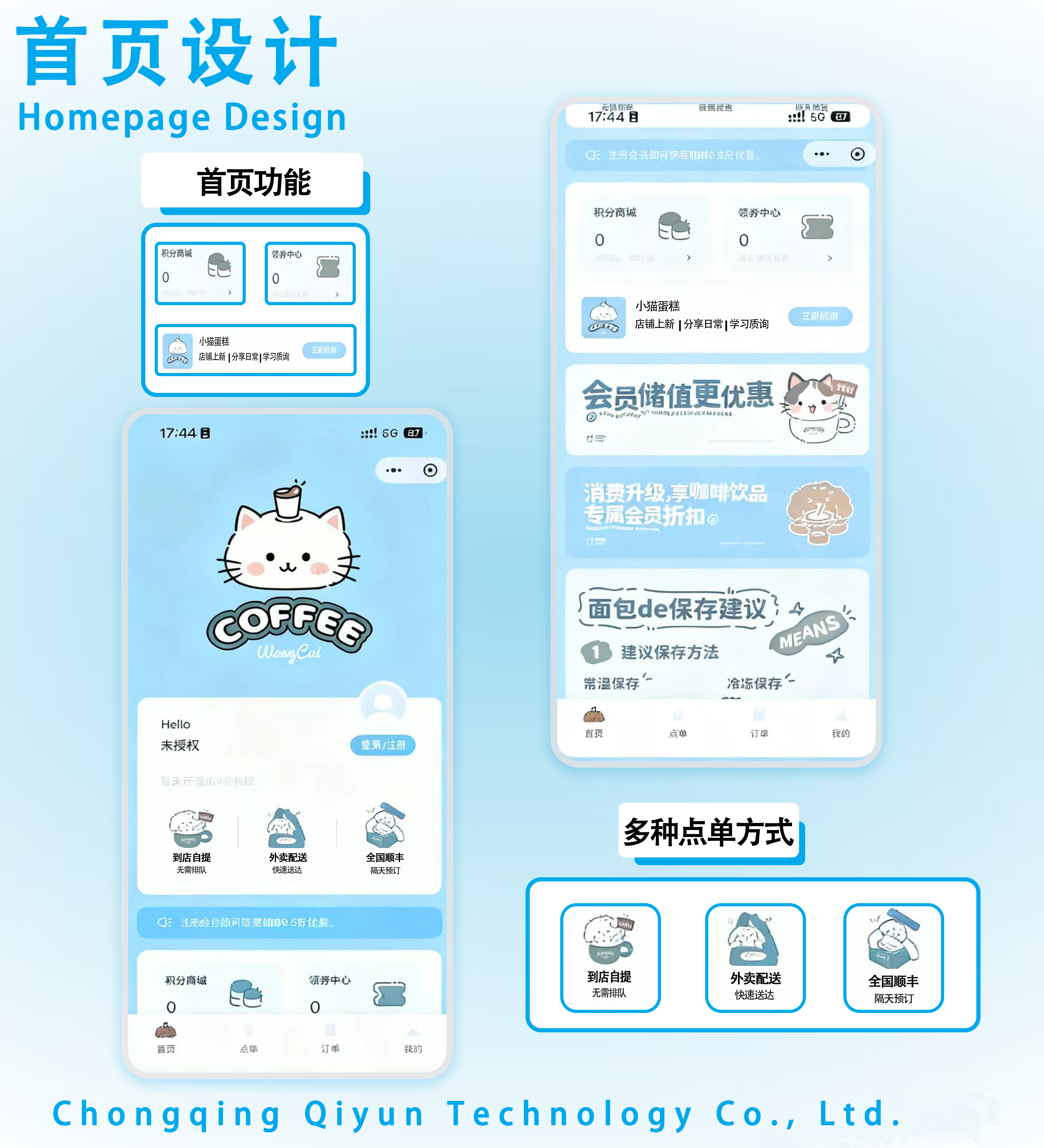 萌宠主题咖啡品牌小程序首页,以清新治愈的 “蓝白 + 卡通猫” 视觉风格为核心,聚焦咖啡品牌的「到店服务 + 线上点单 + 会员运营」需求,打造轻量化、场景化的用户交互入口,适配咖啡行业的消费场景与年轻客群偏好。