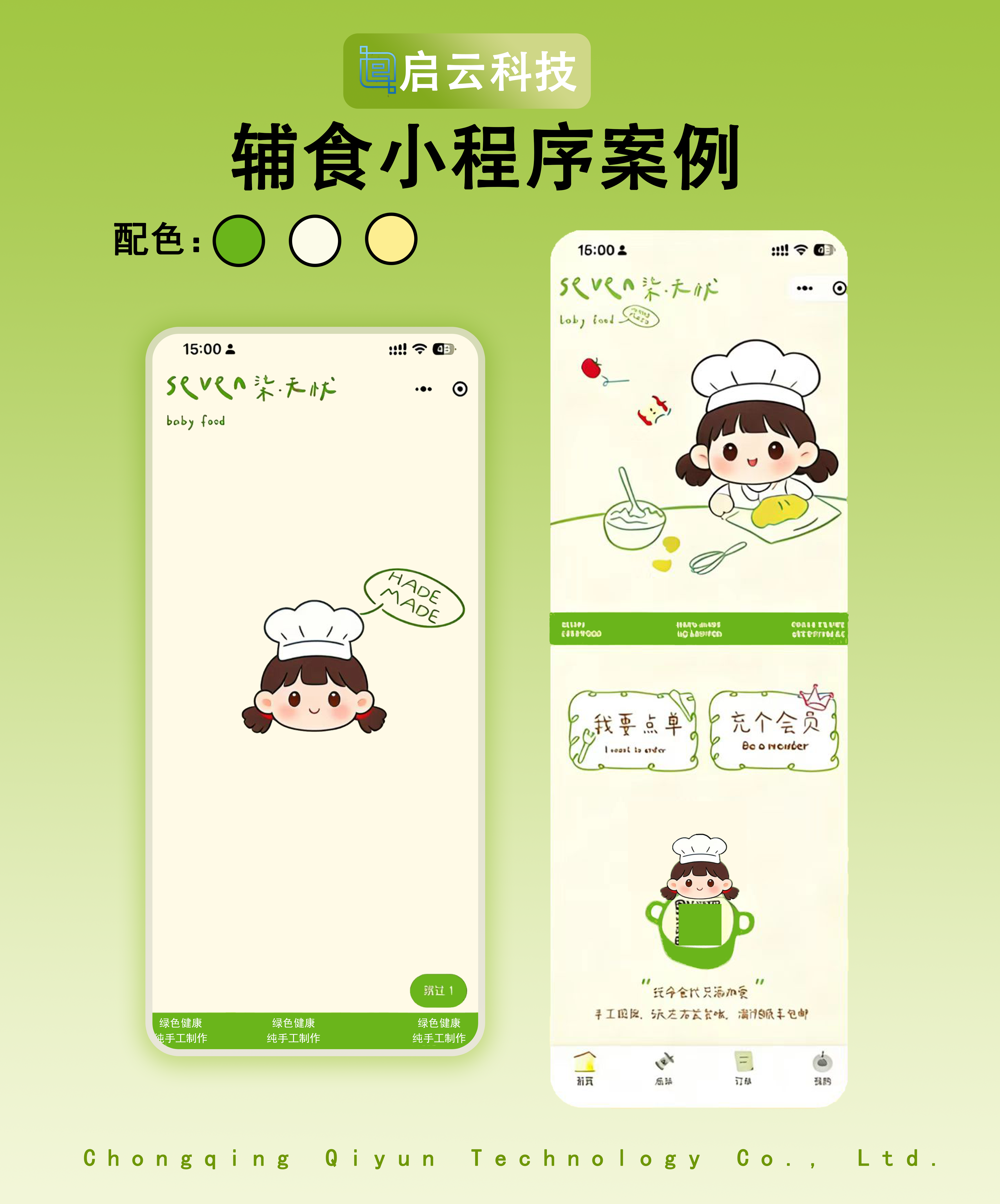 母婴类宝宝辅食专属小程序,以 “清新绿 + 暖黄” 为核心配色,搭配萌系卡通厨娘形象,聚焦 0-3 岁宝宝家庭的「辅食购买 + 会员服务」需求,主打 “纯手工制作” 的健康辅食定位,是轻量化、情感化的母婴辅食消费工具。