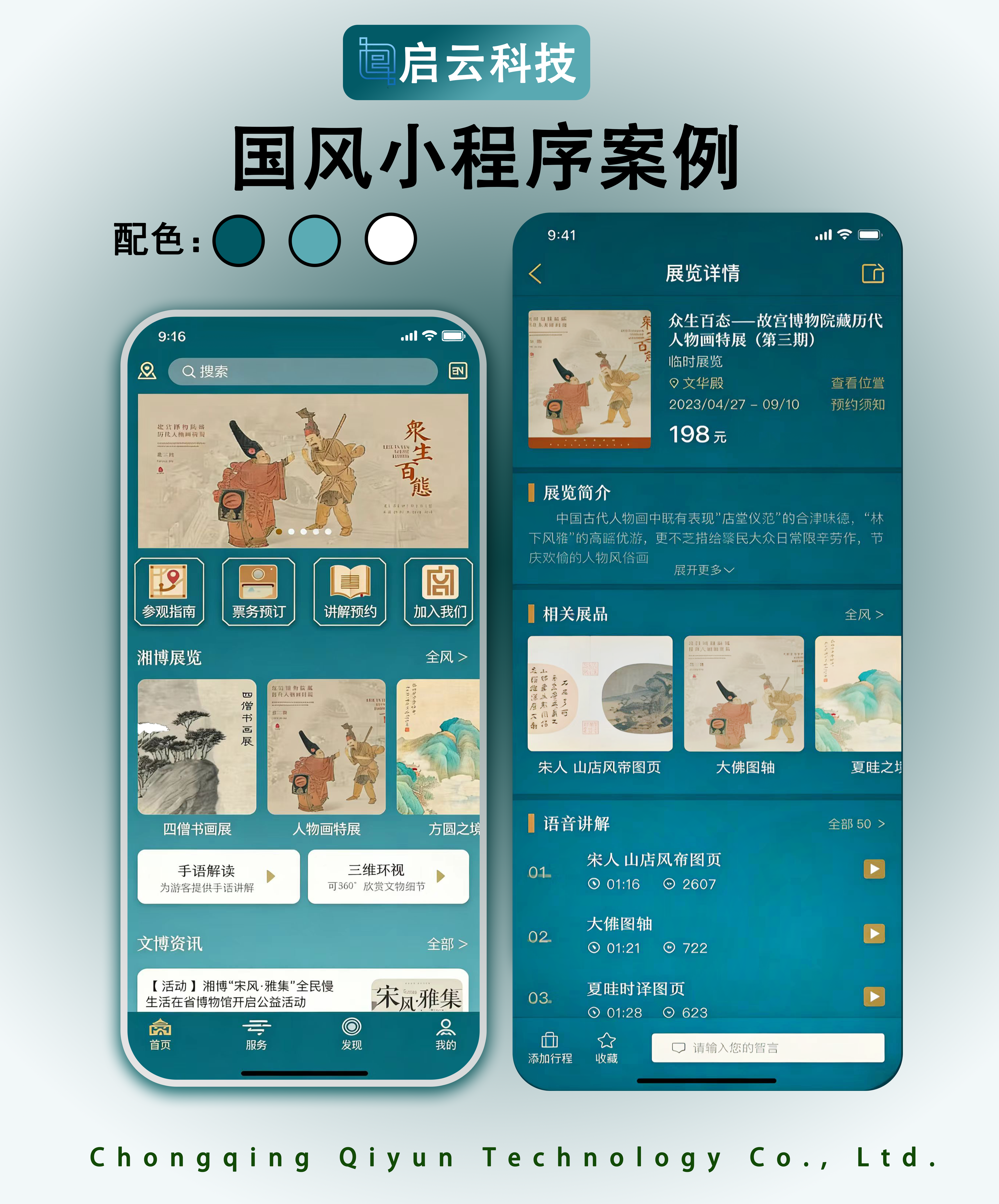 文博类国风主题小程序,以 “青蓝 + 浅白” 的传统色调为视觉基底,融合古籍纹样、文物元素,聚焦博物馆 / 文博机构的「展览服务 + 数字体验 + 文化传播」需求,是连接线下文博场景与线上用户的数字化工具,适配文化爱好者、文博游客的多元需求。