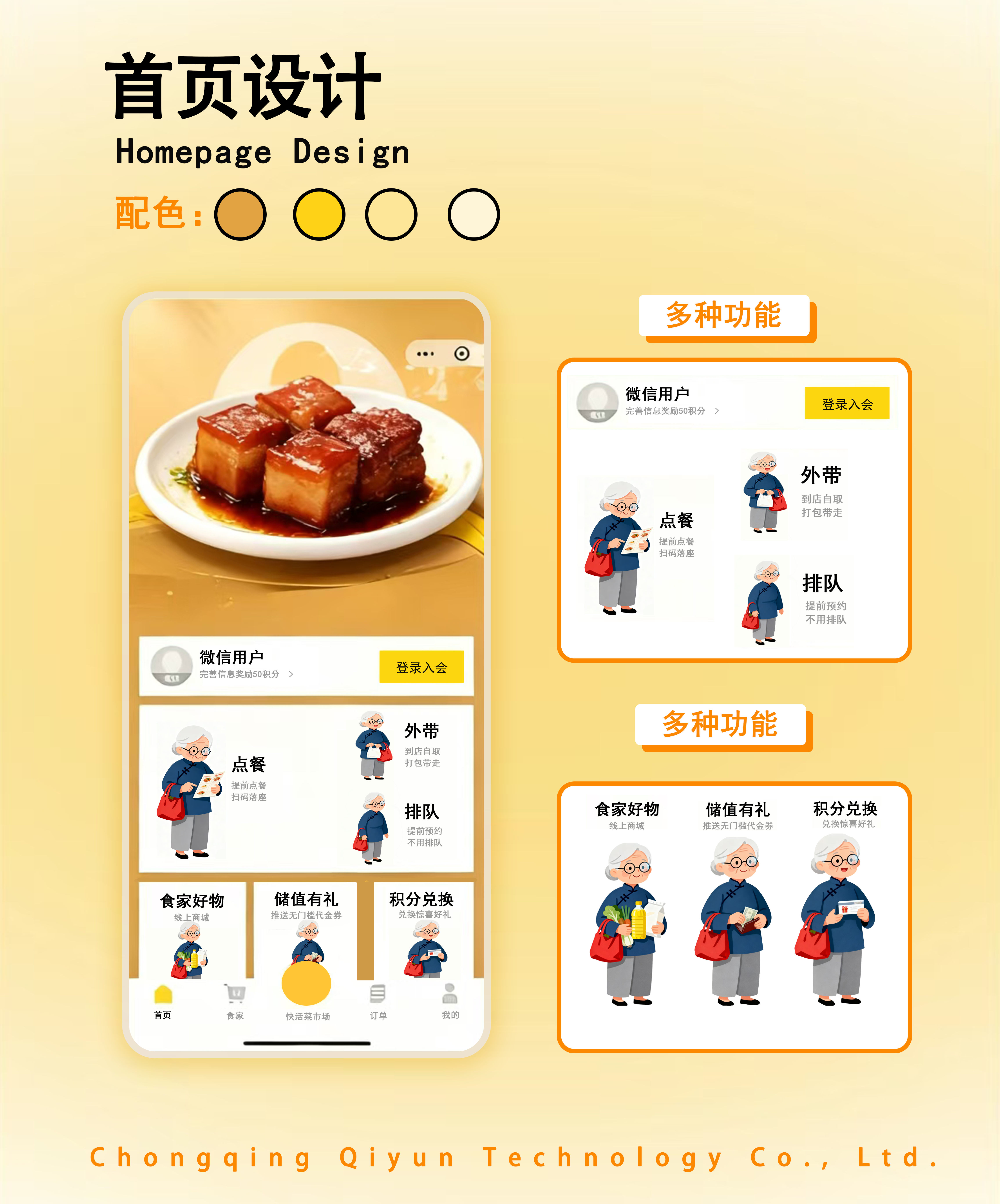中式餐饮品牌专属小程序,以暖黄为主色调搭配复古卡通厨师形象,聚焦中餐门店的「全场景消费 + 会员营销 + 服务效率」需求,打造 “烟火气 + 轻量化” 的餐饮服务工具,适配中餐食客的点餐、排队、福利兑换等日常消费场景。