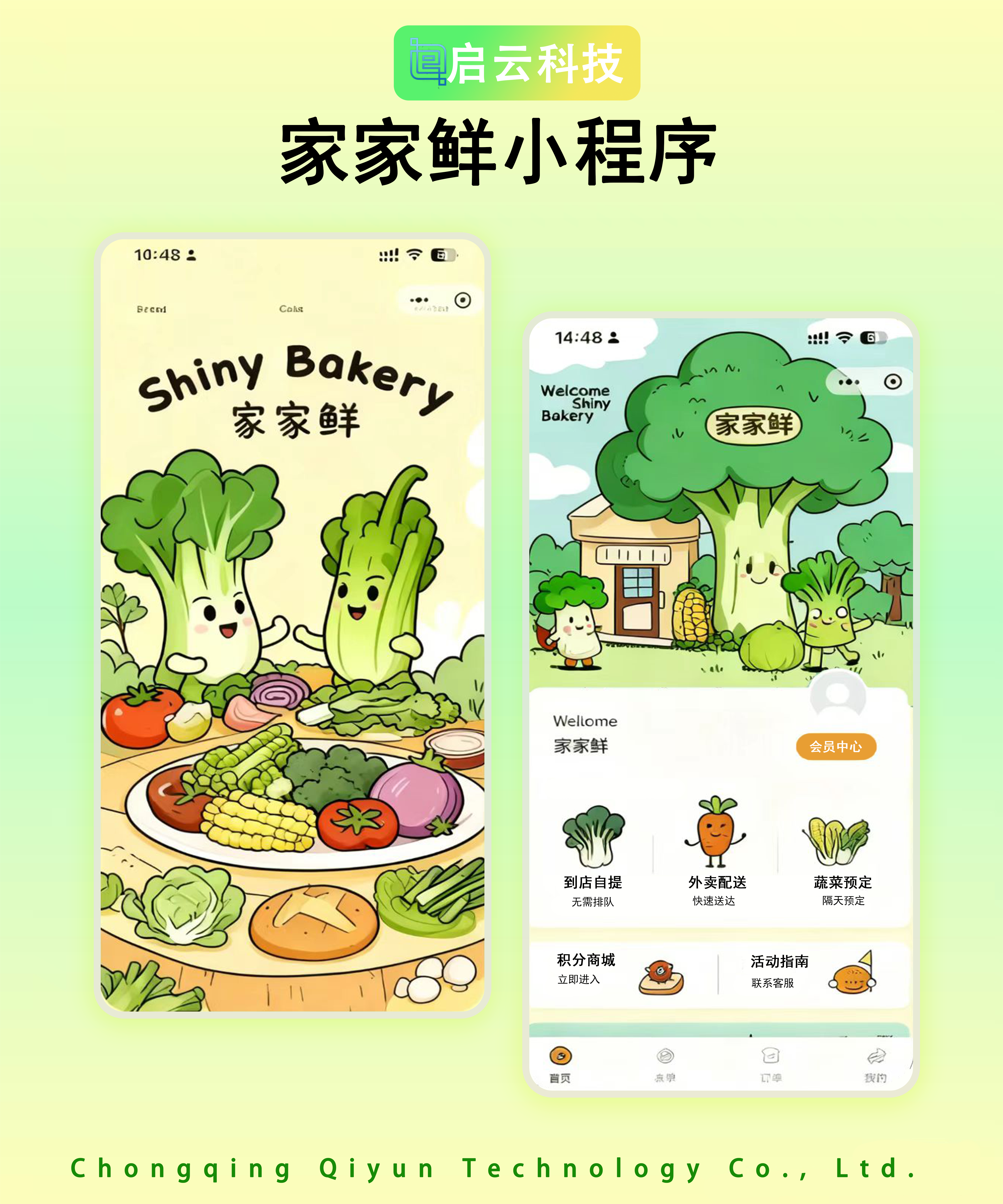生鲜零售类小程序,以 “清新浅绿 + 暖黄” 为核心配色,搭配拟人化蔬果卡通形象,聚焦社区生鲜 / 轻食品牌的「到店自提 + 外卖配送 + 提前预订」需求,打造 “新鲜、便捷、趣味化” 的生鲜消费工具,适配家庭用户、社区居民的日常采购场景。