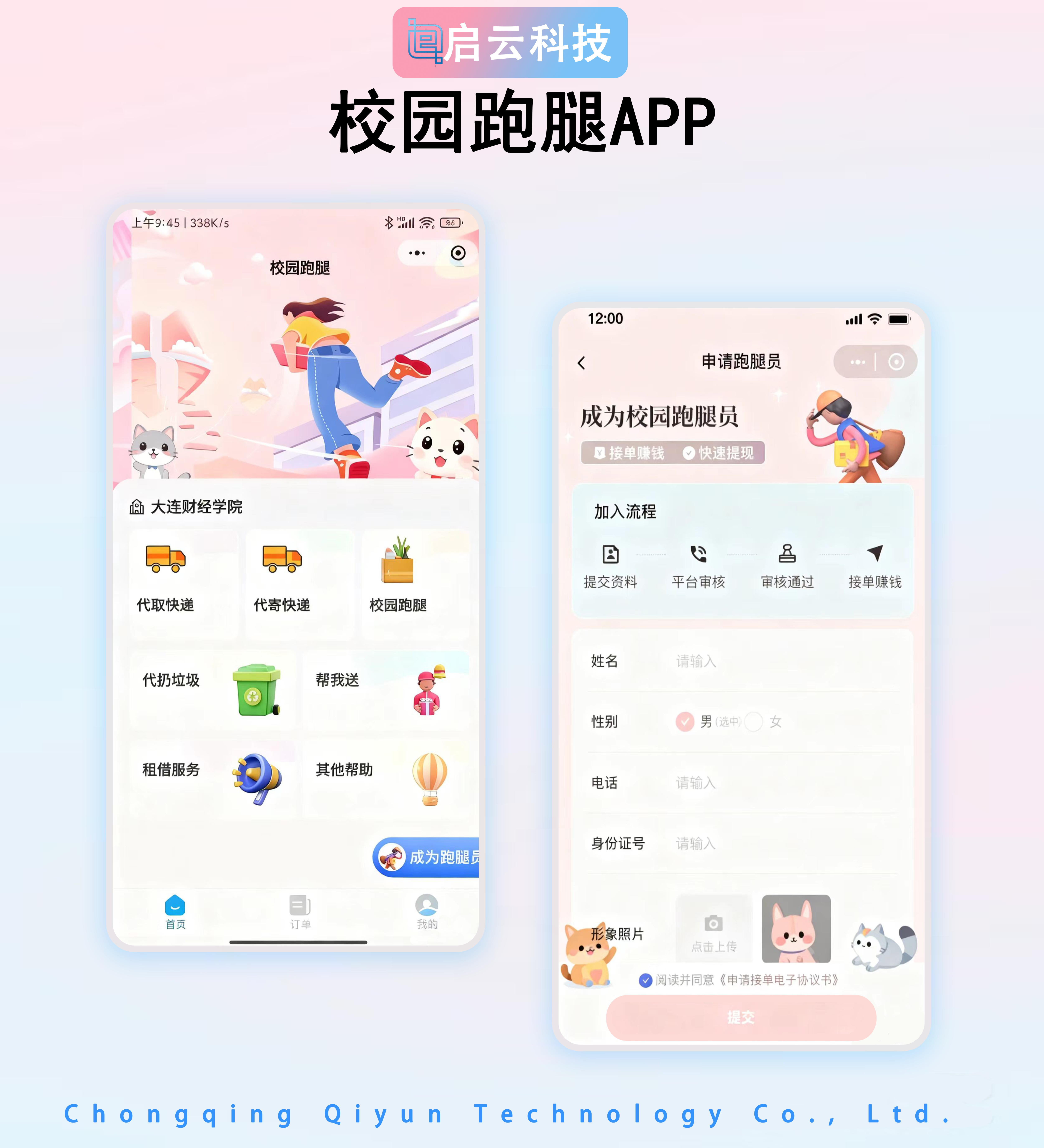 校园专属生活服务 APP,以粉蓝渐变的清新色调搭配萌系卡通形象,聚焦高校学生的「代取、代办、互助」需求,打造 “轻量、便捷、安全” 的校园生活工具,适配学生群体的日常服务场景(取快递、代送物品、租借服务等)。