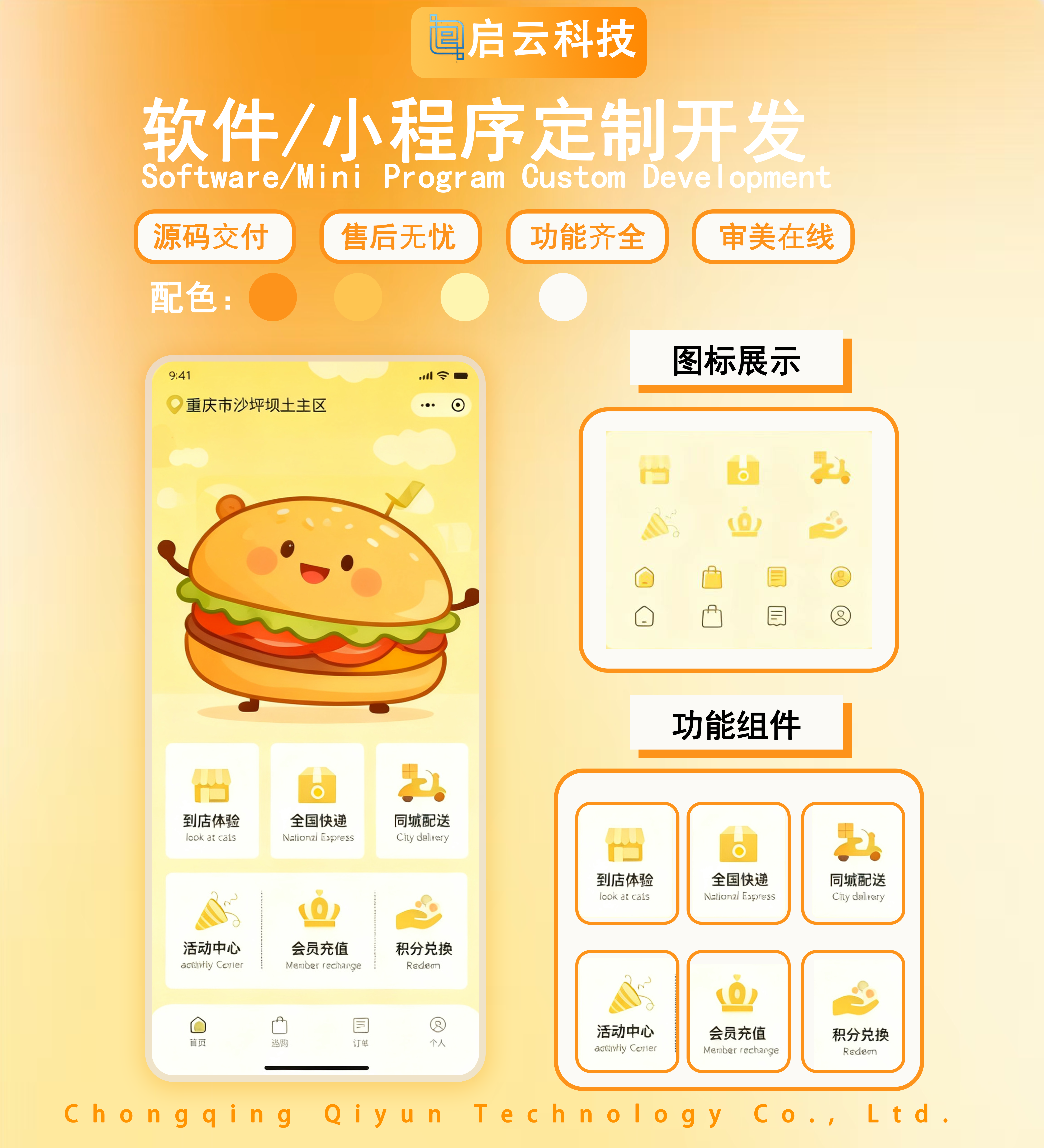 美食主题小程序,以暖橙为主色调搭配萌系卡通汉堡形象,聚焦餐饮行业的「多渠道消费 + 会员运营 + 活动触达」需求,打造轻量化、高适配的餐饮服务工具,适配快餐、轻食等品牌的线上化运营场景。