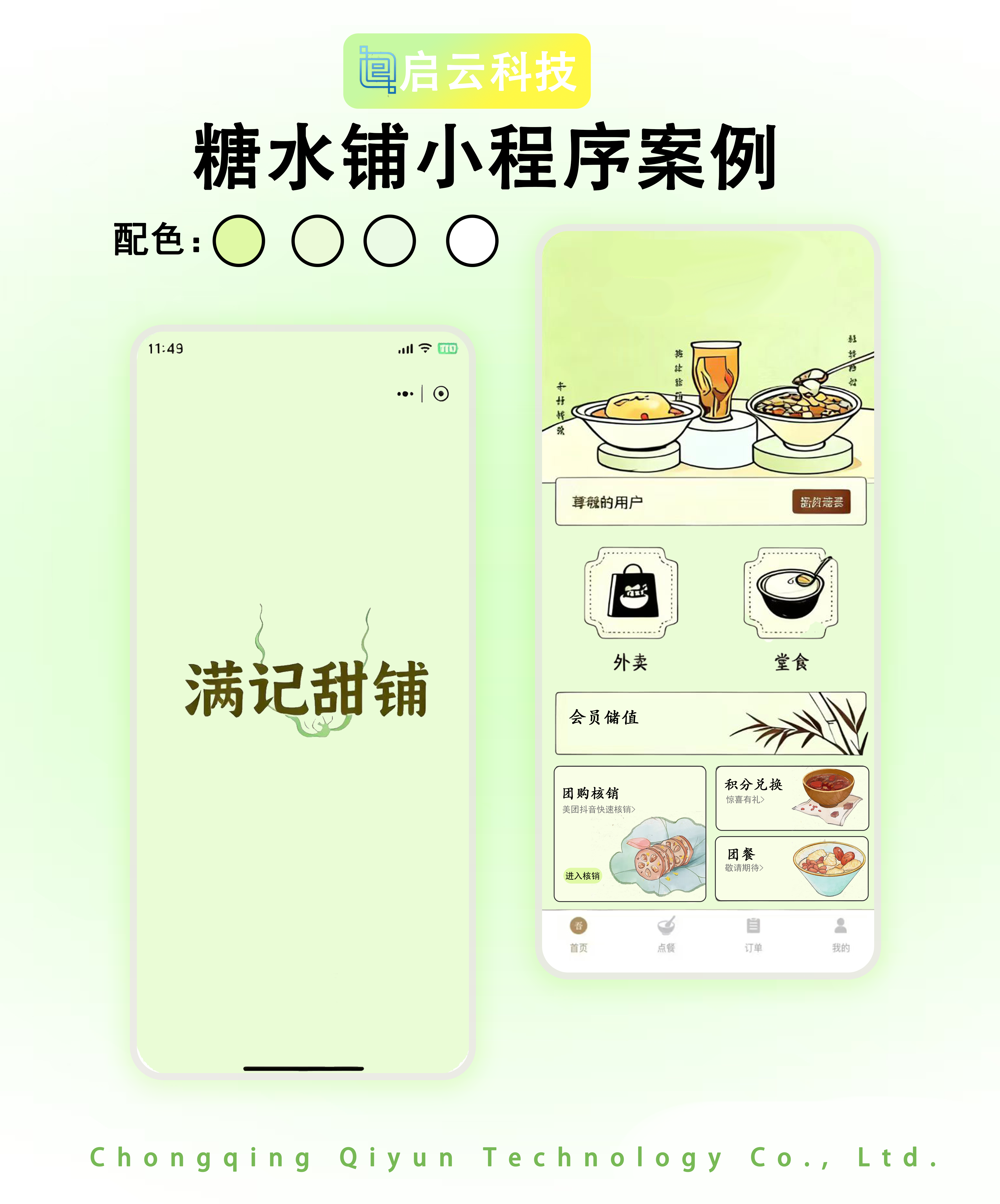 糖水餐饮类小程序,以清新浅绿为主色调,搭配中式甜品插画风格,聚焦糖水铺的「堂食点单、外卖配送、会员运营」需求,打造 “温馨、便捷、轻量化” 的甜品消费工具,适配甜品爱好者的日常点餐与糖水铺的线上化运营场景。