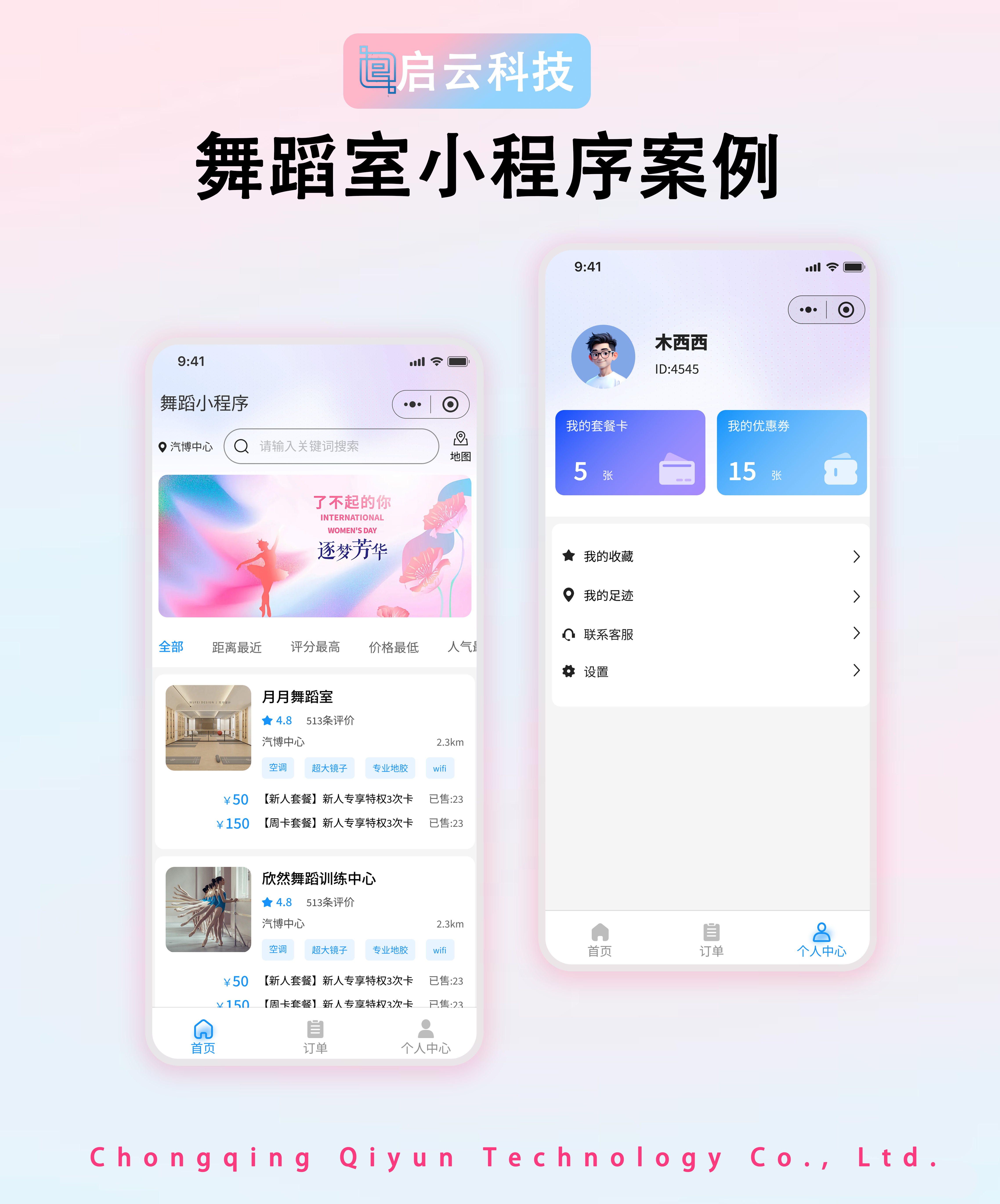 舞蹈培训行业专属小程序,以粉蓝渐变的时尚色调为视觉基底,结合舞蹈主题插画,聚焦舞蹈室 / 培训机构的「场地预订、课程选购、会员管理」需求,打造 “轻量化、场景化” 的舞蹈服务工具,适配舞蹈爱好者、学员的选课与消费场景。